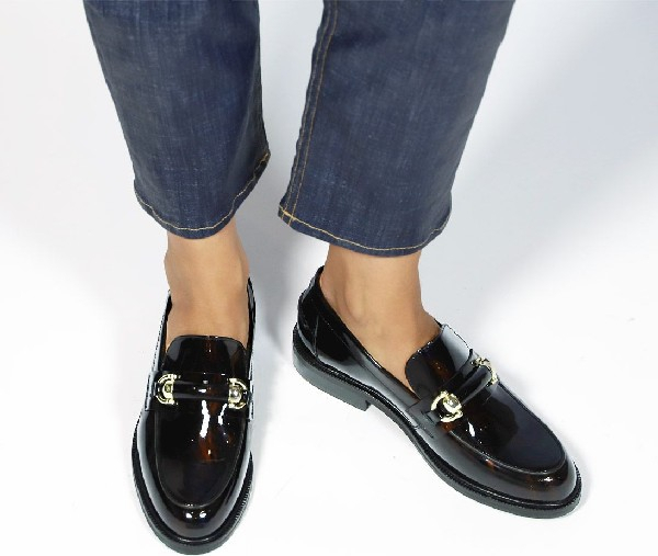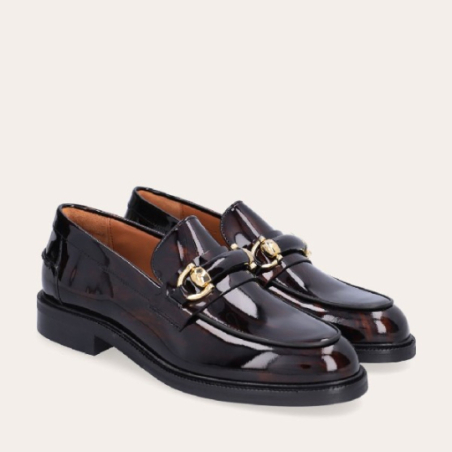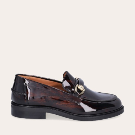 Mocassin marron marbré fait main en cuir laqué avec bout rond et détails décoratifs sur l'avant-pied. Le mocassin est orné d'une boucle en cuir et or. La forme de la chaussure s'inspire des chaussures classiques pour hommes combinées à des détails féminins.