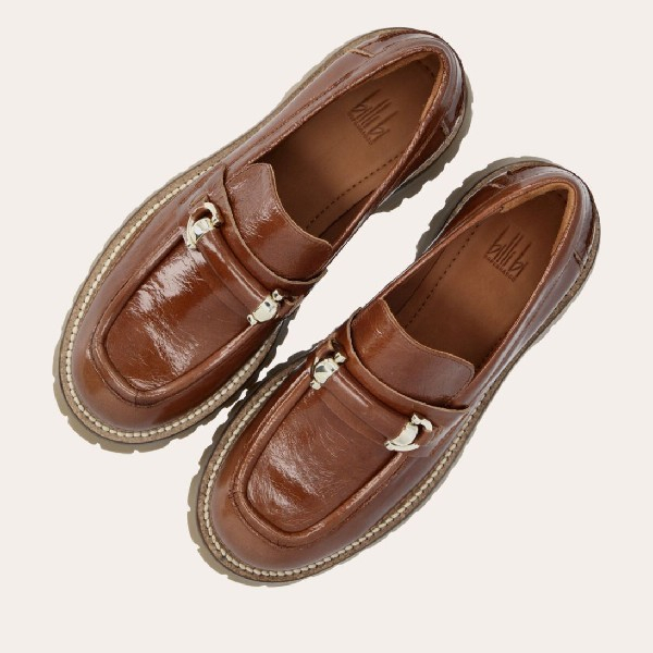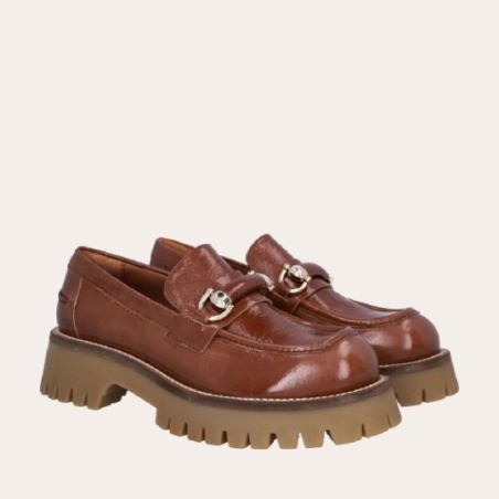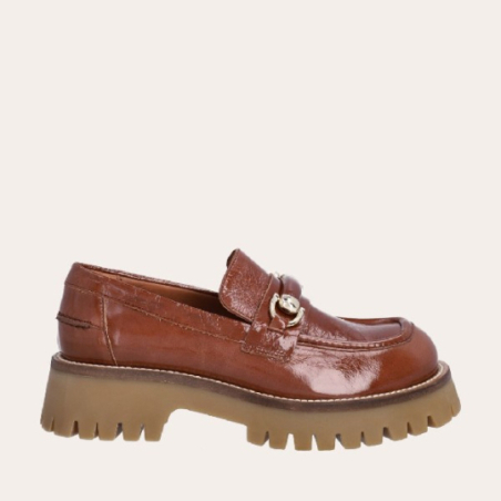 Mocassin fait main, en cuir laqué marron clair avec un bout rond. Le mocassin est orné d'une bride et de boucles dorées sur le devant. Le mocassin a une semelle de piste extra épaisse, cousue avec des points solides.