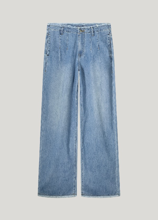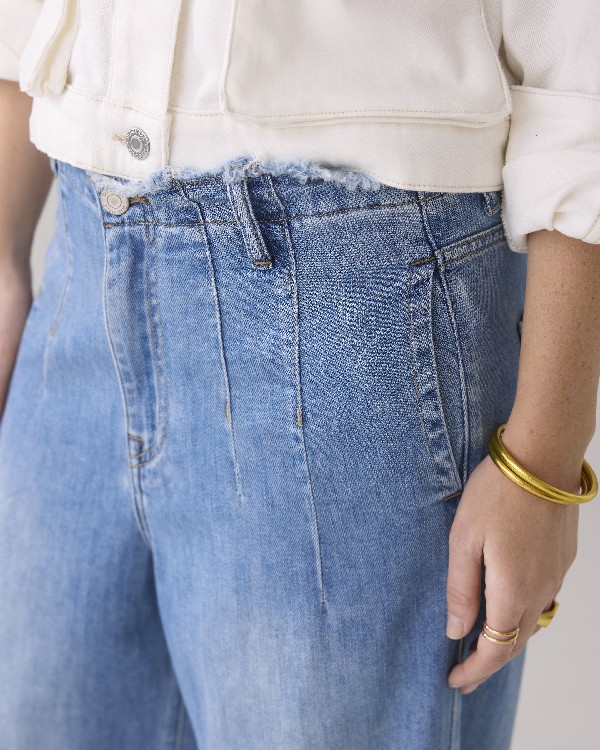 Ce pantalon palazzo est confectionné en denim souple non extensible et lavable au rinçage. Le jean présente des détails à bords francs au niveau de la taille et sur le bas des jambes.
