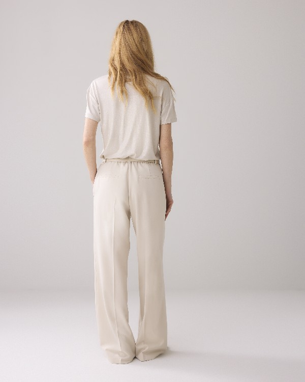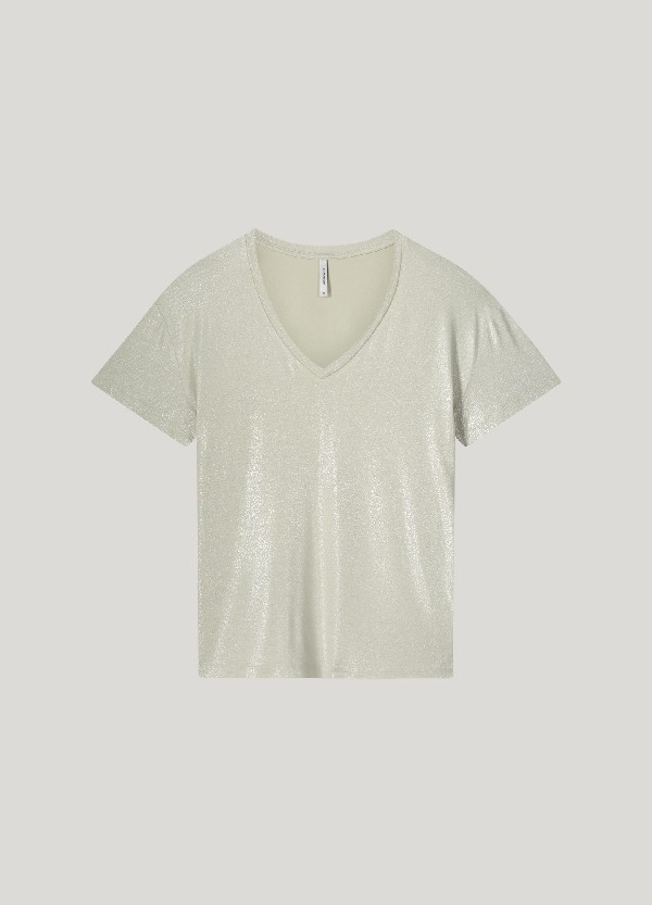 Top coupe classique en jersey de viscose imprimé et brillant. Le haut a un col en V et des manches courtes.