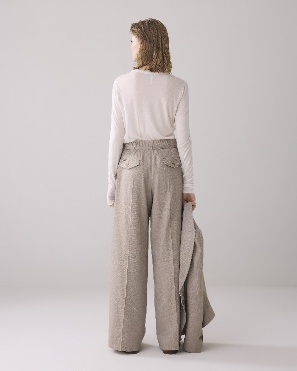 Ce pantalon possède un pli repassé sur le devant et une ceinture en tissu qui peut être portée de deux manières grâce aux doubles passants de ceinture. La taille élastiquée au dos assure un confort supplémentaire et un ajustement parfait.