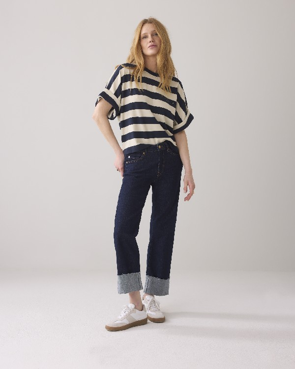 Ce jean Sarin de coupe droite est confectionné en denim stretch et présente une taille mi-haute. Le pantalon a un large ourlet retroussé et une finition à bord franc.