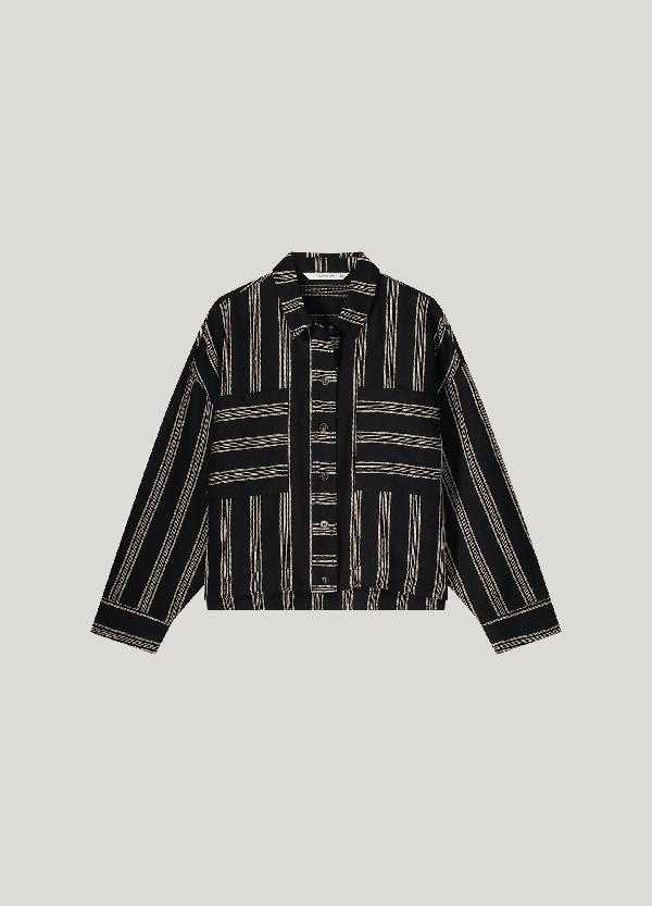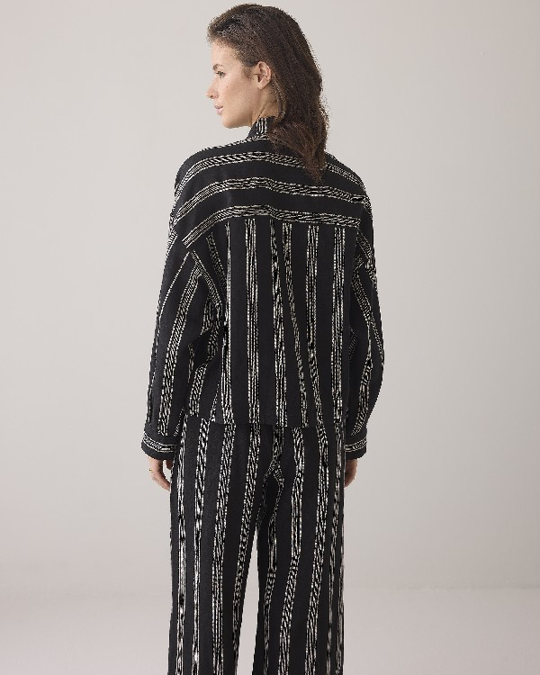 Ce chemisier court à la coupe carrée est confectionné en 100 % lin et présente un col chemisier et des manches longues. Il est doté de poches, d'une fermeture boutonnée et d'un motif à rayures horizontales et verticales.