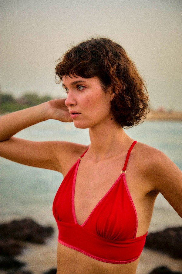 Haut de maillot de bainCoupe triangleMousses amoviblesDos nu à lacetDécolleté en VBande large sous la poitrine pour un bon maintienFronces sous les seins qui mettent en valeur la poitrines