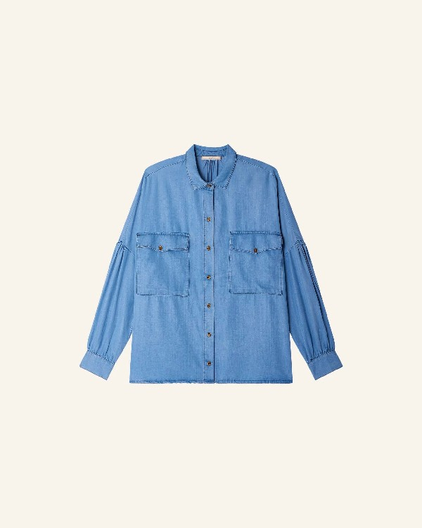 Chemise à emmanchures basses froncées et poches plaquées en chambray de lyocell délavé tissé en Espagne.Ce produit est composé de TENCEL™ Lyocell, fibres issues de sources de bois renouvelables certifiées gérées durablement et utilisant un procédé limitant la pollution et les rejets toxiques.TENCEL™ est une marque déposée de Lenzing AG.