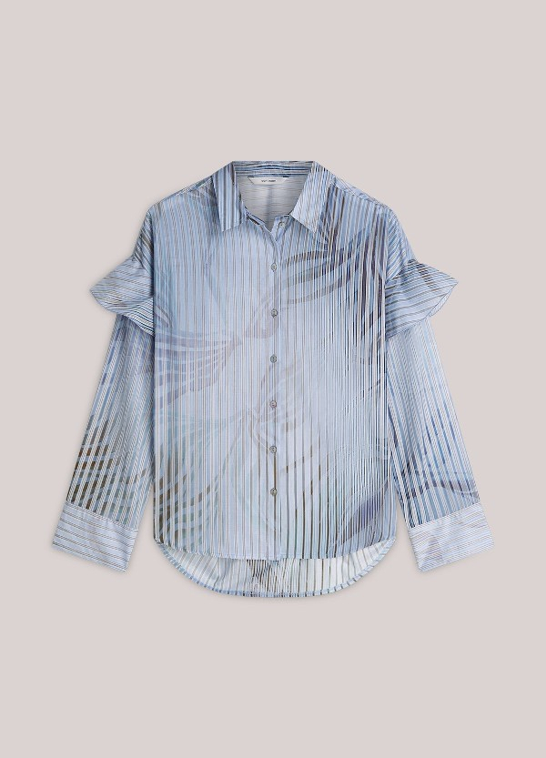 Chemisier en coton rayé à motif de feuilles discret. Ce chemisier présente des épaules tombantes, des volants aux poignets et de larges poignets avec fermeture à double bouton réglable.100% coton