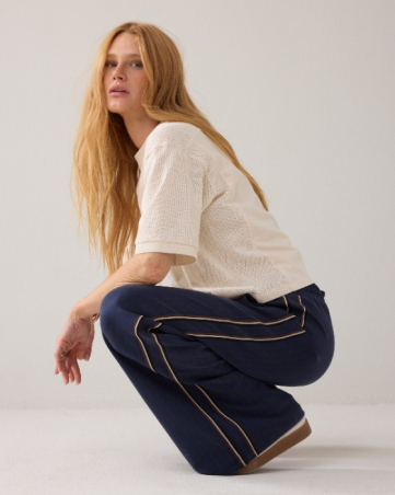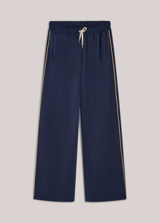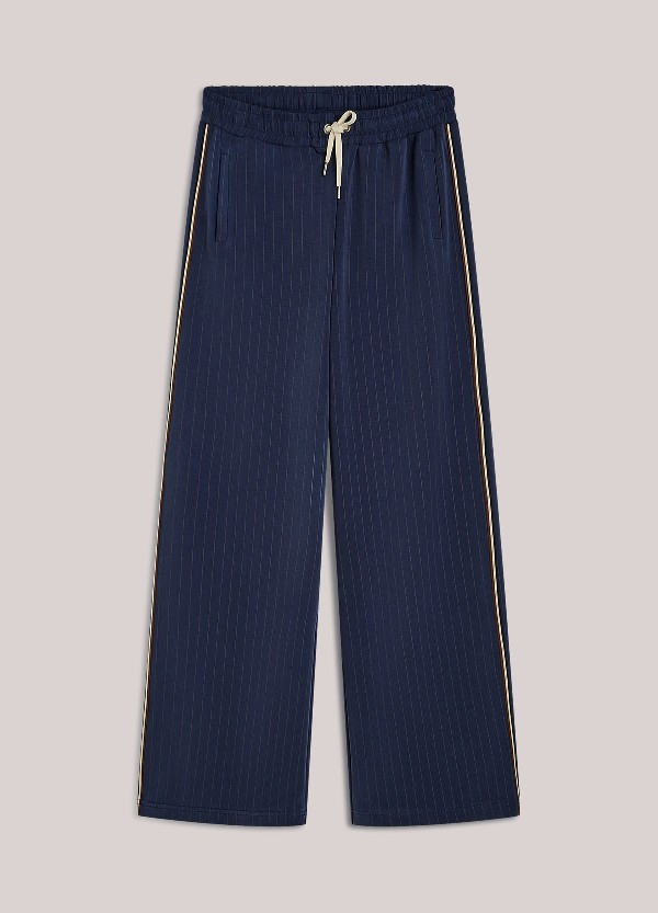 Pantalon de plongée à fines rayures avec taille élastiquée et cordon de serrage contrastant. Ce pantalon confortable possède des jambes larges et un liseré sportif le long des coutures latérales.• Plongée à fines rayures• Jambes larges• Taille élastiquée• Poches passepoilées à l'avant, fausses poches à l'arrière