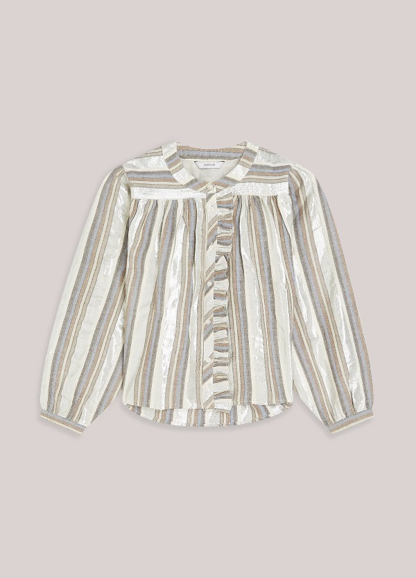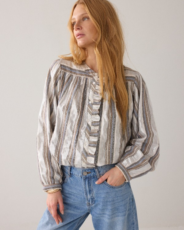 Chemisier en coton orné d'une rayure argentée en lurex assortie aux couleurs de la collection. Ce chemisier présente des manches chauve-souris et des rayures multidirectionnelles. Le tissu a l'aspect d'un coton brut, tout en étant très agréable au toucher.