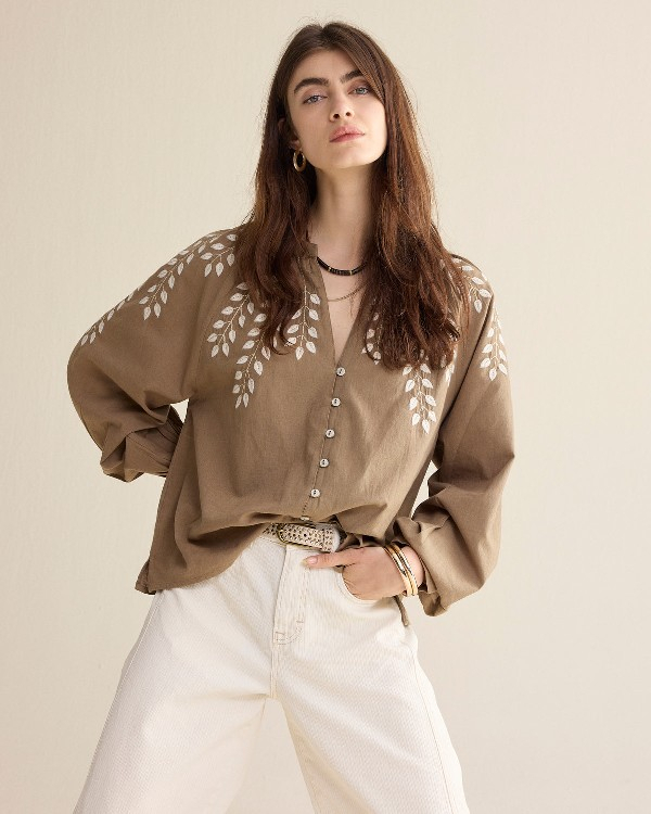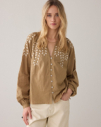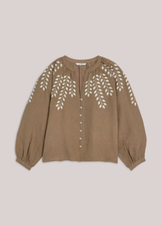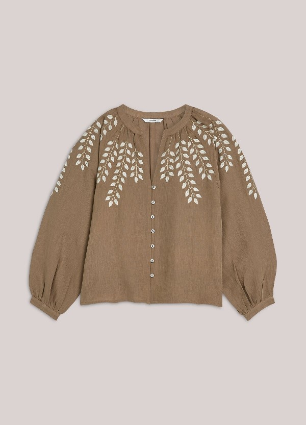 Chemisier en coton aspect lin orné de délicates broderies. Coupe ample, boutons avec brides et plis aux poignets.• Coton aspect lin• Fente en V• Fermeture boutonnée avec brides et œillets métalliques• Coupe ample85 % coton, 15 % élasthanne