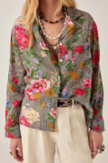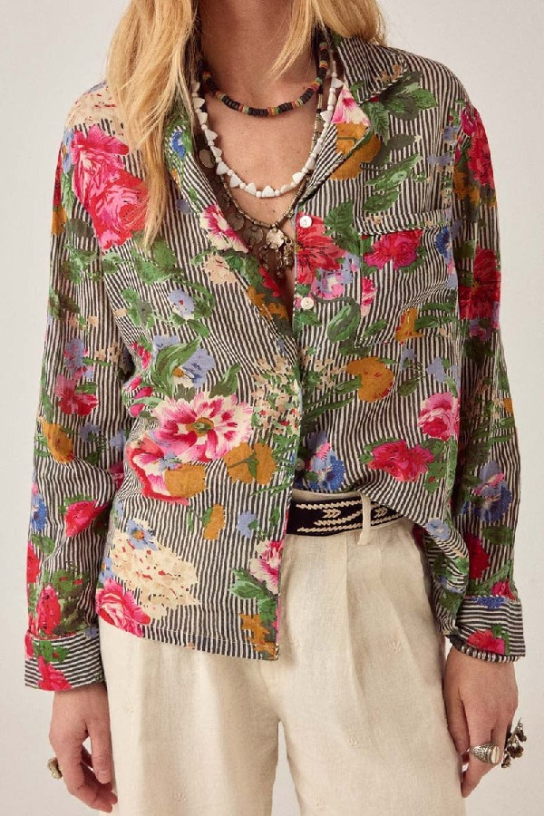 Chemise décontractée en coton à fines rayures et imprimé floral. Col classique, fermeture boutonnée, poche poitrine, manches longues à poignets souples. Inspirée des silhouettes de pyjamas. Les fines rayures servent de toile de fond, les fleurs se déploient naturellement sur le tissu.Hulton Soul offre une sensation intime et douce au toucher, un style équilibré et confortable. L'imprimé, expressif sans excès, est intégré à la matière. Un coton doux et facile à porter.Portez-la ample, ouverte ou boutonnée. Rentrez-la dans un pantalon Otto ou laissez-la apparente. Elle se porte seule ou superposée.