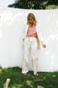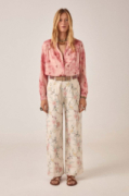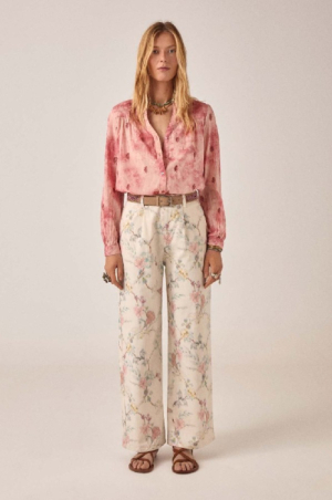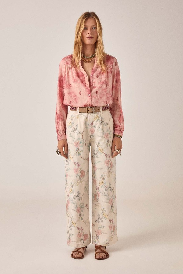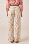 Pantalon large en coton légèrement élasthanne. Taille haute avec fermeture boutonnée et zippée, deux plis sur le devant, poches latérales. Jambe ample et fluide qui tombe parfaitement. Maintien et souplesse.Imprimé botanique délicat : lys, tiges et fleurs sauvages dans des tons rose pâle, bleu et jaune sur fond crème. Un motif qui évoque une illustration de jardin ancienne, comme celles qu’on trouve entre les pages d’un livre ancien.À porter avec la chemise Narciso assortie pour un look complet, ou à mixer avec la chemise Rani, comme notre styliste. Se porte aussi bien avec des sandales plates qu’avec des bottines. Fluide, facile à porter et inspiré par la nature.
