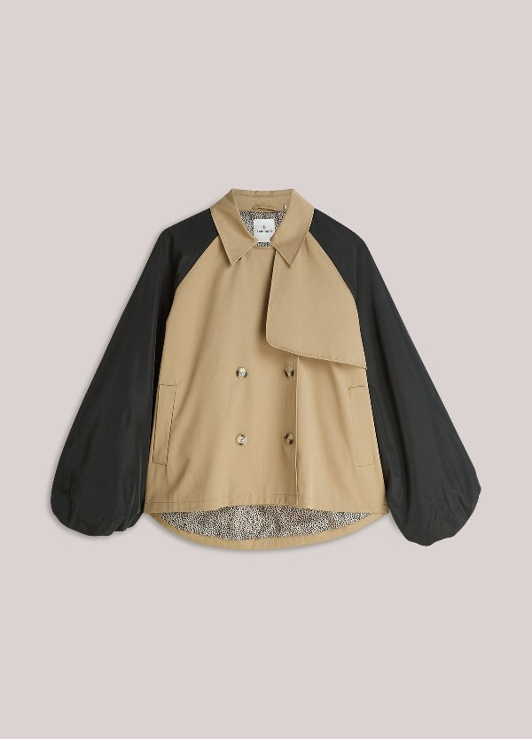 Trench-coat court en coton mat à manches bouffantes brillantes contrastantes. Coupe oversize avec un large pli creux au dos pour un volume accru. Doublure confortable.Corps en coton mat, manches brillantes.Coupe oversize.Détail en tissu sur le devant gauche.Fermeture boutonnée.53 % coton, 47 % polyester