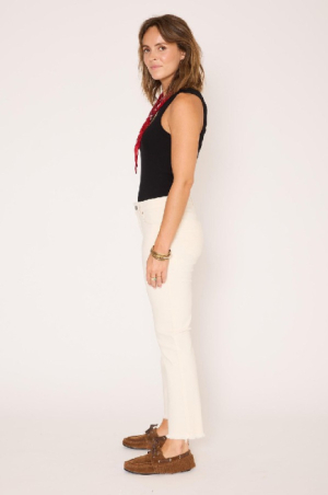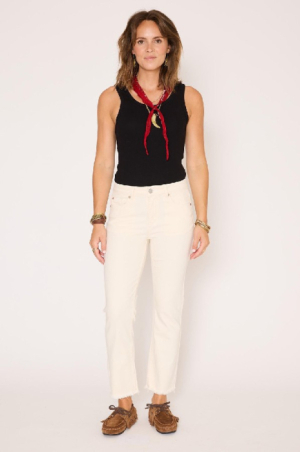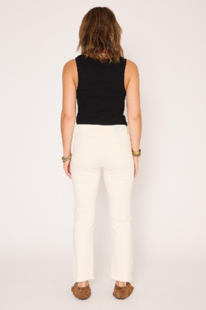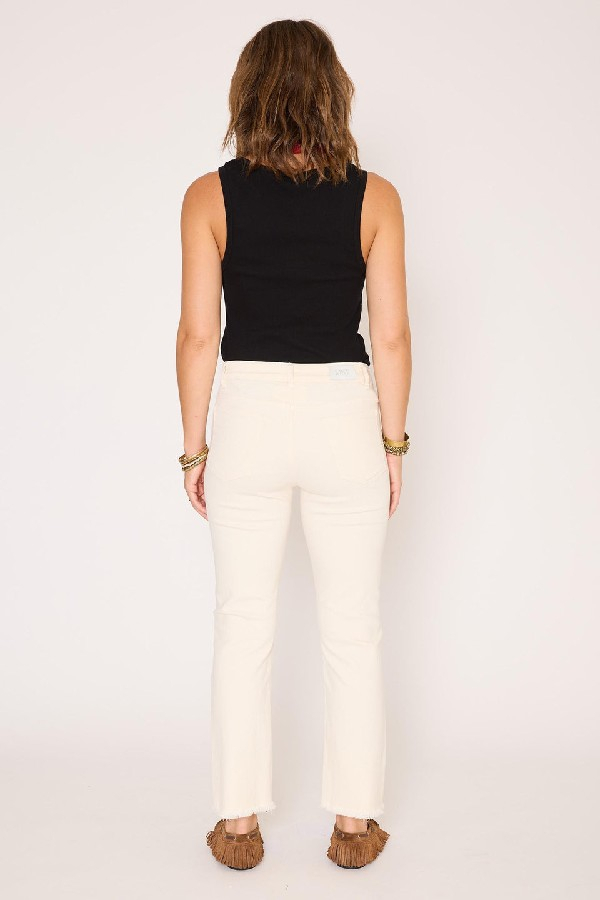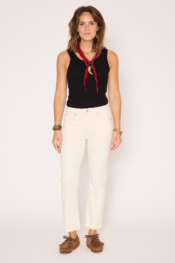 The Sophia Sunset Drill revisite l’allure casual avec une élégance naturelle et une touche estivale. Sa coupe droite légèrement ajustée structure la silhouette tout en conservant un confort absolu, tandis que la matière drill apporte une tenue souple et agréable au porter. Décliné dans une teinte naturelle lumineuse, il s’impose comme un essentiel facile à associer, parfait pour une silhouette à la fois simple, moderne et féminine. Détails : Coupe droite légèrement ajustée Taille regular Toile drill douce et confortable Fermeture zippée et bouton métallique gravé Cinq poches Longueur cheville Bas légèrement effiloché pour une finition décontractéele mannequin mesure 175cm et porte une taille 38/M/28