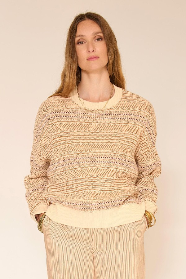 Le jeu de mailles apporte du relief tout en restant doux et lumineux. Ce pull mise sur une coupe confortable, légèrement ample, avec un tombé souple qui se porte naturellement au quotidien. Facile à associer à un pantalon fluide ou un denim, il s’inscrit dans un vestiaire cosy et élégant, pensé pour les transitions de saison.le mannequin mesure 175cm et porte une taille 38/M/28Composition : 100 % COTON