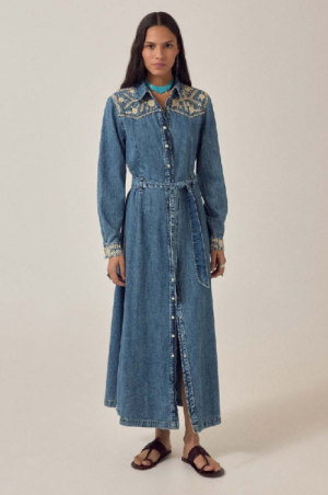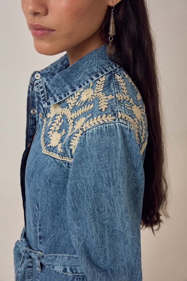 Denim de coton lavé, doux dès le premier essayage – pas besoin de le faire. Robe-chemise longue à fermeture boutonnée sur toute la longueur, col et manches longues avec poignets boutonnés. Ceinture amovible à nouer permettant d'ajuster la silhouette à la taille.Broderie ivoire à l'empiècement et aux poignets. Un détail subtil qui met en valeur le denim sans le masquer. Le tissu est léger, fluide, plus proche d'un chambray patiné que d'un denim rigide.À porter aussi bien avec des bottes qu'avec des sandales plates. Une robe facile à porter.