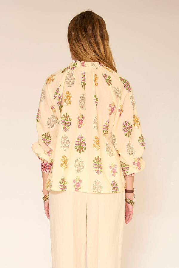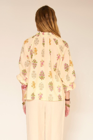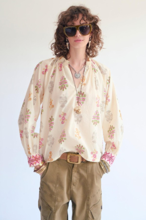 Notre blouse Chopin séduit par son imprimé délicat aux accents bohèmes, subtilement réchauffé par des touches colorées. La coupe fluide apporte une belle aisance au porté, tandis que l’encolure ouverte et les fronces aux épaules dessinent un tombé naturel et féminin. Les manches longues, ponctuées de poignets contrastés, ajoutent du caractère sans alourdir la silhouette. Une pièce facile à vivre, à associer aussi bien à un pantalon clair qu’à un denim pour une allure chic et décontractée.le mannequin mesure 175cm et porte une taille 38/M/28
