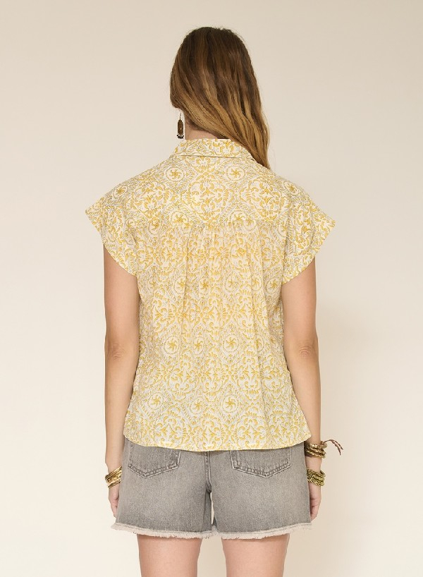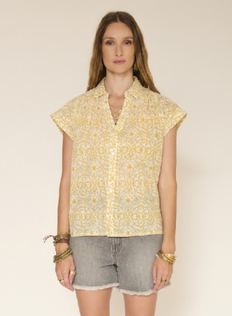 Un imprimé solaire aux nuances jaune et écru qui apporte immédiatement de la fraîcheur au look. La coupe est droite et fluide, avec des manches courtes légèrement évasées qui dégagent l’épaule et allègent la silhouette. Le tombé est naturel, facile à vivre, parfait pour les journées d’été.À porter simplement avec un short en denim ou un jean clair pour un esprit estival lumineux et décontracté.