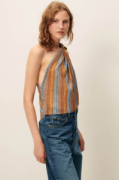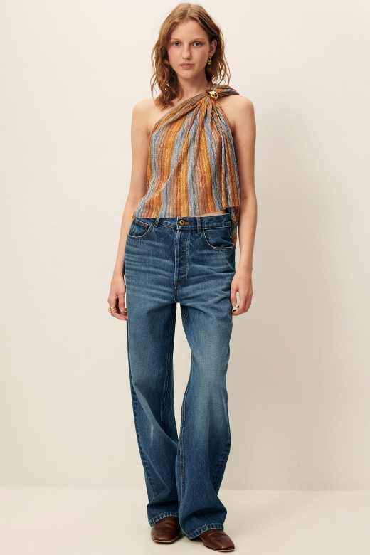 Col rond.Sans manches.Dos twisté orné d'une bague métallique martelée.67% Lyocell 33% CotonMade in Portugal