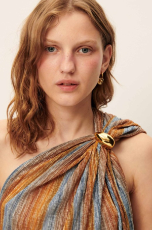 Top asymétrique drapé en crêpe de polyester métallisé plissé.Orné d'une broche bijou amovible exclusive Sessùn.Détails de boutons bijoux sur le côté.