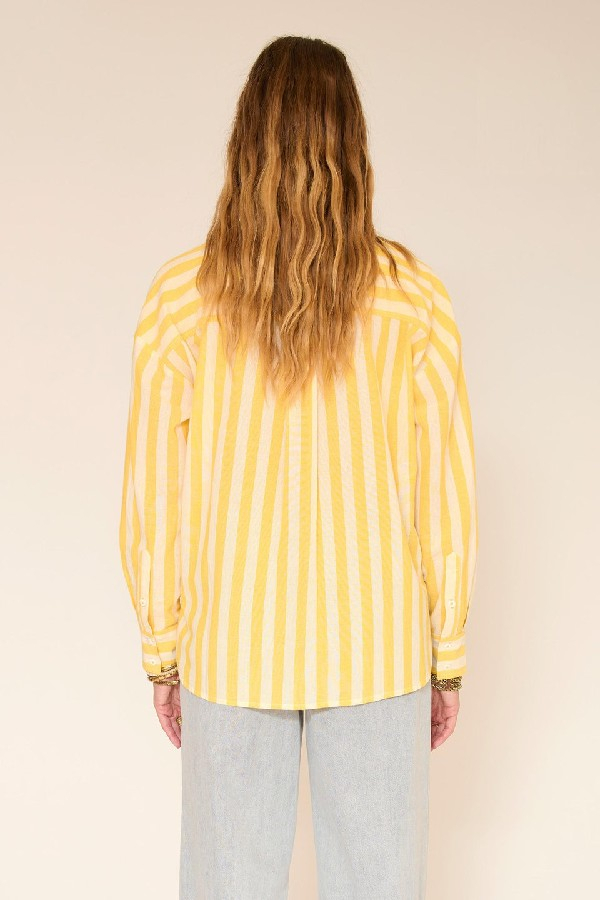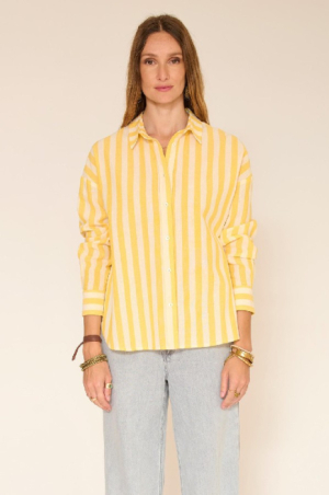 Un esprit chemise d’été, facile et lumineuse. Les rayures jaunes apportent tout de suite de l’éclat, adoucies par un tissu léger au tombé fluide. La coupe est droite, légèrement ample, avec des épaules souples qui donnent une allure décontractée mais soignée. Portée rentrée dans un jean clair ou laissée libre sur un pantalon écru, elle fonctionne aussi bien en journée qu’en fin de journée, manches retroussées pour encore plus de nonchalance.le mannequin mesure 175cm et porte une taille 38/M/28