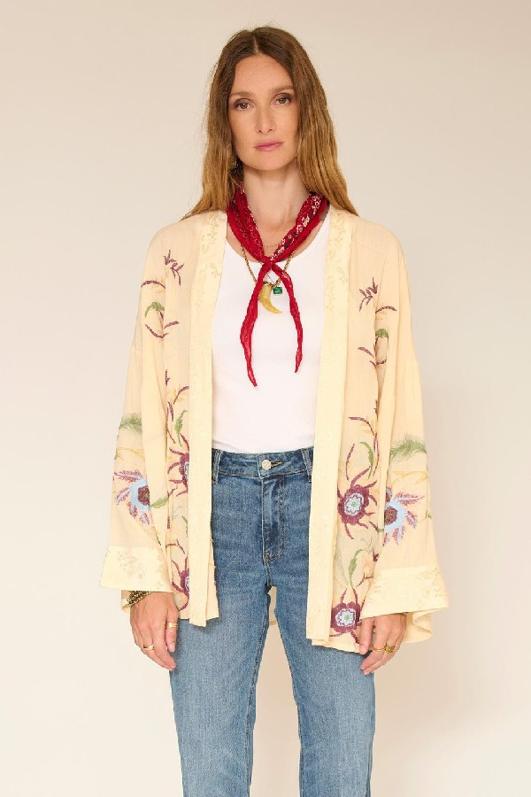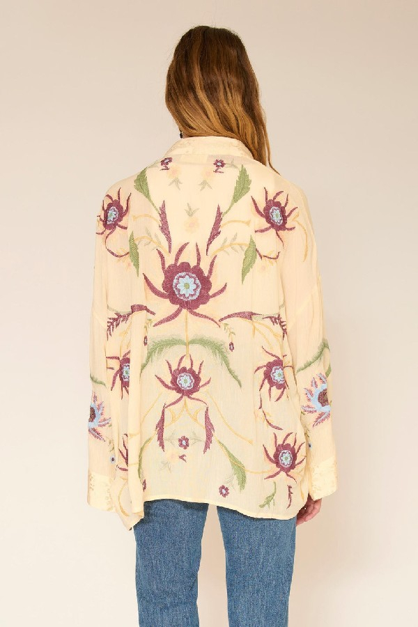 Les jeux de broderies encadrent la silhouette et apportent une touche graphique subtile. La blouse se distingue par son volume fluide et sa matière légère, agréable à porter au quotidien. Portée avec un denim, elle compose une allure bohème chic, simple et lumineuse, idéale pour les beaux jours.le mannequin mesure 175cm et porte une taille 38/M/28