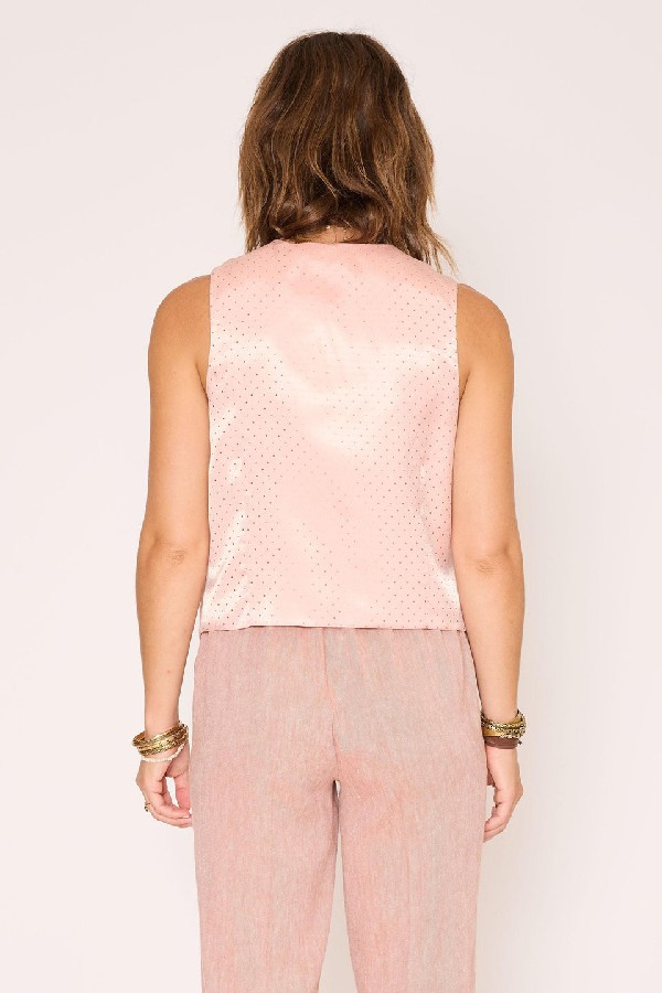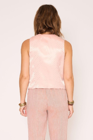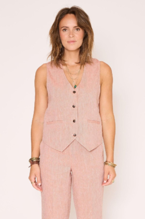 Le gilet Gery se distingue par sa coupe droite légèrement ajustée et son encolure en V qui soulignent la silhouette avec élégance, tout en restant confortable. Sans manches et boutonné sur le devant, il adopte des finitions soignées avec de discrètes poches passepoilées et un bas légèrement pointu d’inspiration tailleur. Décliné en Terracotta, il apporte une touche chaleureuse et naturelle au vestiaire, tandis qu’en Blush, il séduit par sa douceur et sa luminosité, offrant une alternative délicate et moderne ; porté seul ou en superposition, le gilet Gery s’impose comme une pièce polyvalente, facile à associer pour un look chic et équilibré.le mannequin mesure 175cm et porte une taille 38/M/28